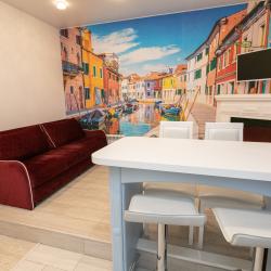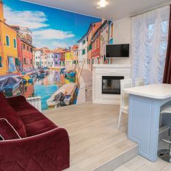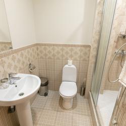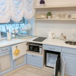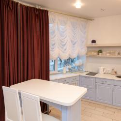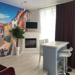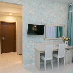 Апартаменты имеют одну спальную комнату и зал с электрическим камином совмещенный с кухней. Кухонная зона оборудована электрической плитой, чайником и необходимой посудой. В номере 2 телевизора, кабельное телевидение, рабочий стол, диван. Ванная комната оснащена душевой кабиной, феном. Предоставляется набор гигиенических принадлежностей.