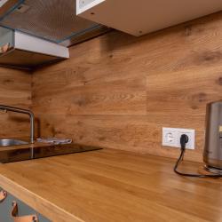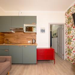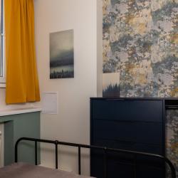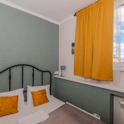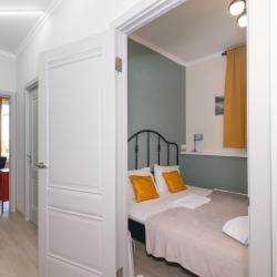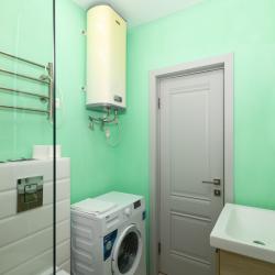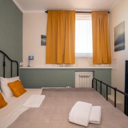 Уютные апартаменты на 6 этаже с комфортом вмещают 4 человека. Изолированная спальня с двуспальной кроватью и кухня-гостиная с раскладным диваном. Есть всё для комфортного проживания: современное кухонное оборудование, набор посуды и столовых приборов, качественная сантехника. Уборка перед заселением, постельное белье и полотенца уже включены в стоимость проживания. Рядом с домом расположена парковка.