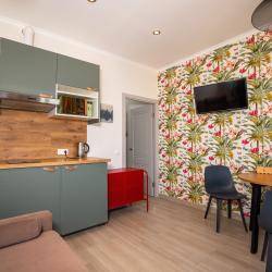 Уютные апартаменты на 6 этаже с комфортом вмещают 4 человека. Изолированная спальня с двуспальной кроватью и кухня-гостиная с раскладным диваном. Есть всё для комфортного проживания: современное кухонное оборудование, набор посуды и столовых приборов, качественная сантехника. Уборка перед заселением, постельное белье и полотенца уже включены в стоимость проживания. Рядом с домом расположена парковка. Вблизи парк «Южные культуры» с множеством экзотических растений и животных. В пешей доступности набережная и ТЦ «Мандарин», 2 парка с новыми детскими площадками. Скейт парк для детей и взрослых. Кафе, бары, рестораны и ночные клубы - в шаговой доступности. Расстояние до аэропорта составит 6 км.